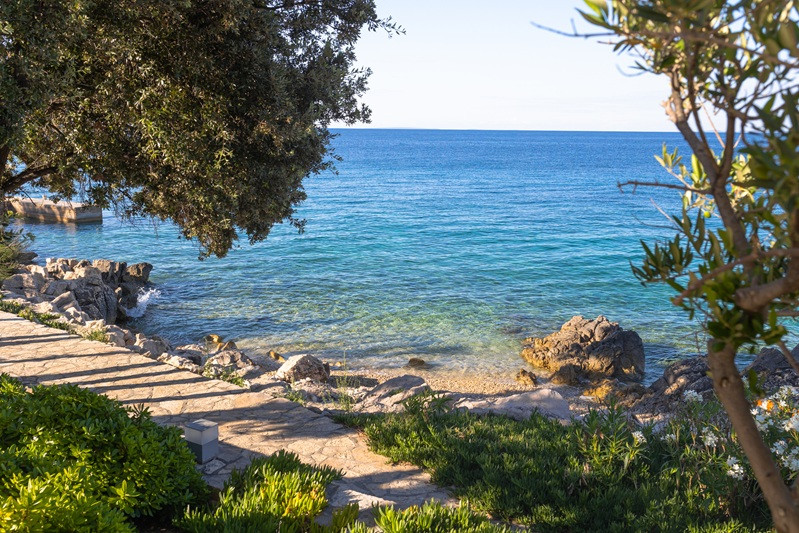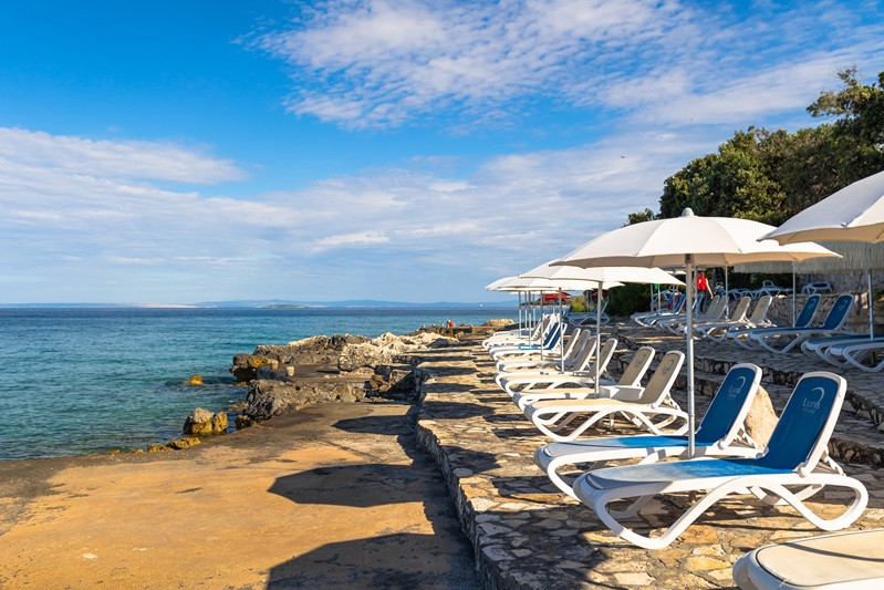 Pláž: cca 30 m, oblázková, přírodní, betonová plata, možnost zapůjčení lehátek a slunečníků na pláži (za poplatek).