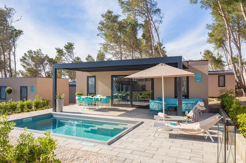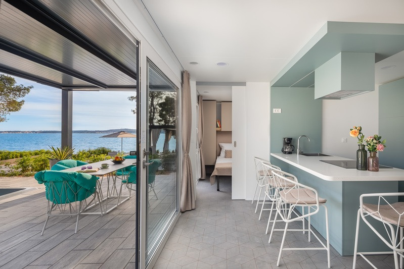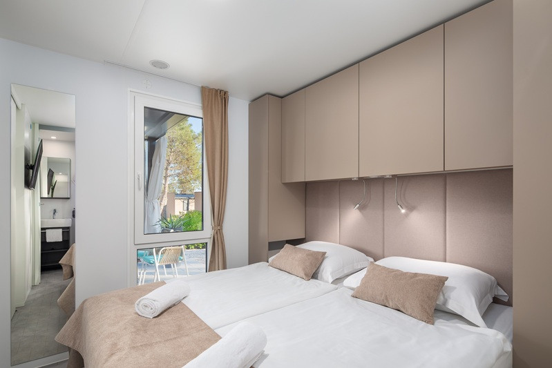 Ubytování: mobilní dům PREMIUM MH4-6, velikost 32,9 m² - 2 oddělené 2lůžkové ložnice (jedna s manželskou postelí, jedna s 2 oddělenými lůžky), denní místnost s rozkládací pohovkou pro 2 děti do 11,99 let, 2 koupelny (premium, 99285); mobilní dům FAMILY PREMIUM MH6-8, velikost 32,9 m² - 3 oddělené 2lůžkové ložnice (jedna s manželskou postelí, dvě s 2 oddělenými lůžky), denní místnost s rozkládací lavicí pro 2 děti do 11,99 let, 2 koupelny (family premium, 99286); mobilní dům LUXURY s bazénem MH4-6, velikost 32,9 m² - 2 oddělené 2lůžkové ložnice (jedna s manželskou postelí, jedna s 2 oddělenými lůžky), denní místnost s rozkládací lavicí pro 2 děti do 11,99 let, 2 koupelny (family premium, 99286); vždy vybavený kuchyňský kout vč.myčky na nádobí, Nespresso coffee přístroj, přístro na filter coffee, jídelní kout, klimatizace, Wi-Fi, TV/sat, zastřešená terasa se zahradním nábytkem.