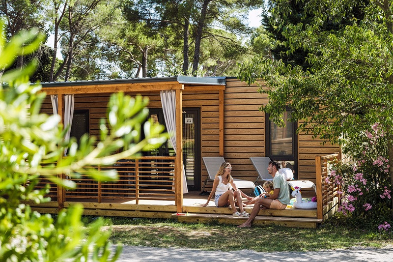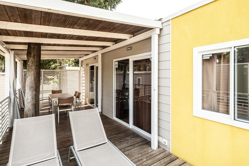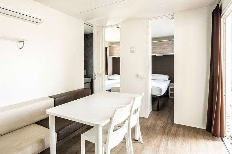 Ubytování: mobilní dům MH4-5, velikost 34 m² - 2 oddělené 2lůžkové ložnice, jedna s manželskou postelí, druhá s oddělenými lůžky, denní místnost s lavicí pro max 1 osobu, 2 koupelny (delux family, 98882); mobilní dům MH5-6, velikost 34,40 m² - 2 oddělené 2lůžkové ložnice, jedna s manželskou postelí, druhá s oddělenými lůžky, denní místnost s rozkládací lavicí pro max 2 osoby, 2 koupelny (superior, 87571); mobilní dům MH4-5, velikost 34,40 m² - 3 oddělené 2lůžkové ložnice, jedna s manželskou postelí a dvě s oddělenými lůžky, denní místnost s lavicí pro max 1 osobu, 2 koupelny (premium, 84443); vždy vybavený kuchyňský kout, klimatizace, Wi-Fi, TV/sat, zastřešená terasa se zahradním nábytkem.