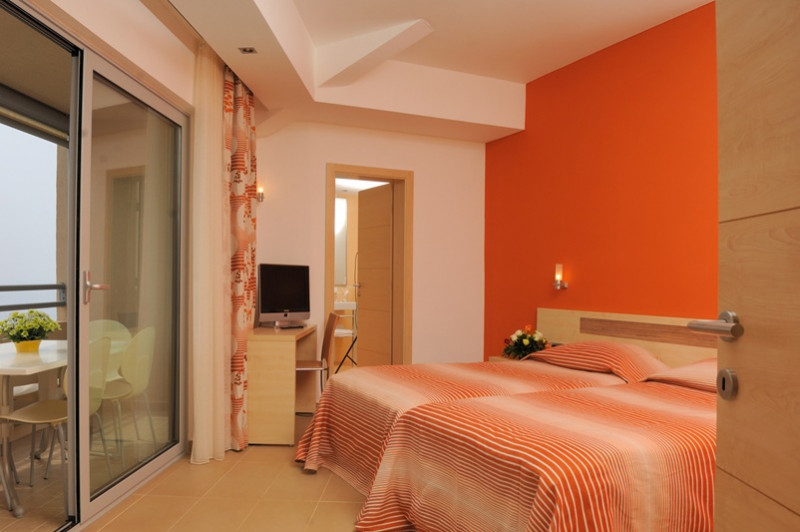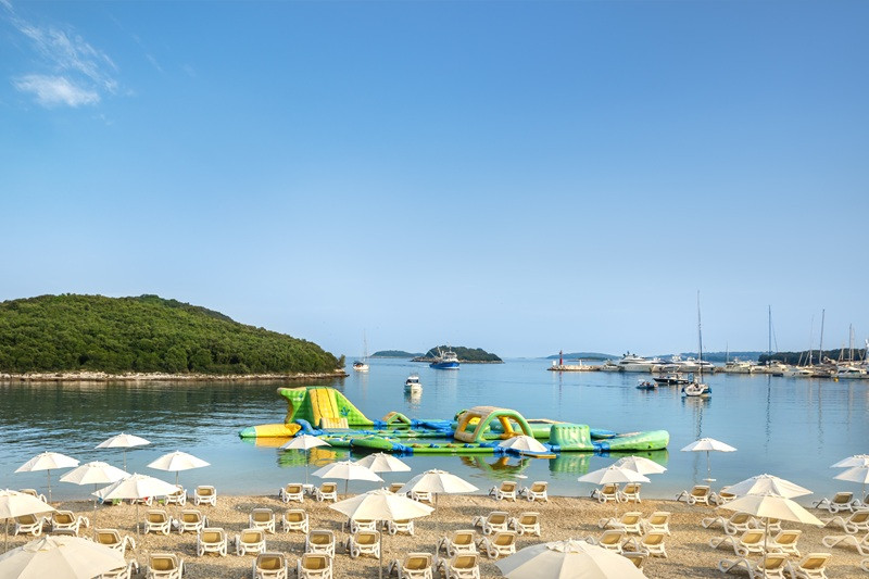 Pláž: oblázková, betonová plata, skalnatá (100 m); možnost zapůjčení slunečníku a lehátek na pláži (za poplatek).